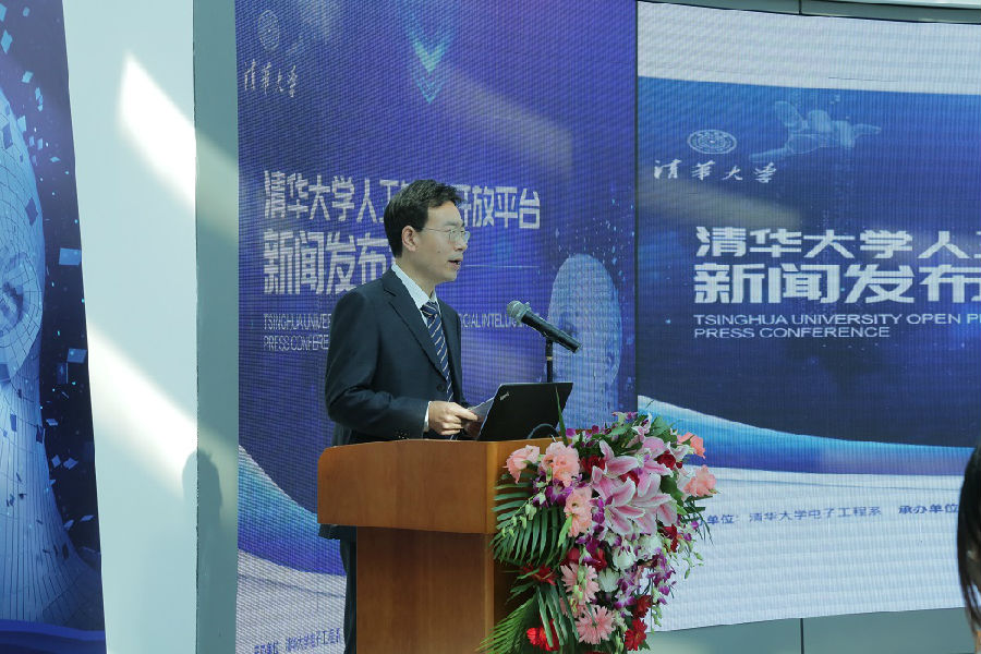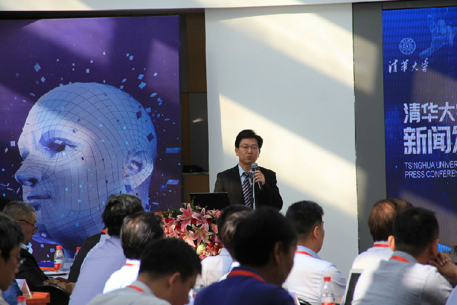 Jin Depeng, Party Committee Secretary of the Department of Electronic Engineering, Tsinghua University, presides over the press conference