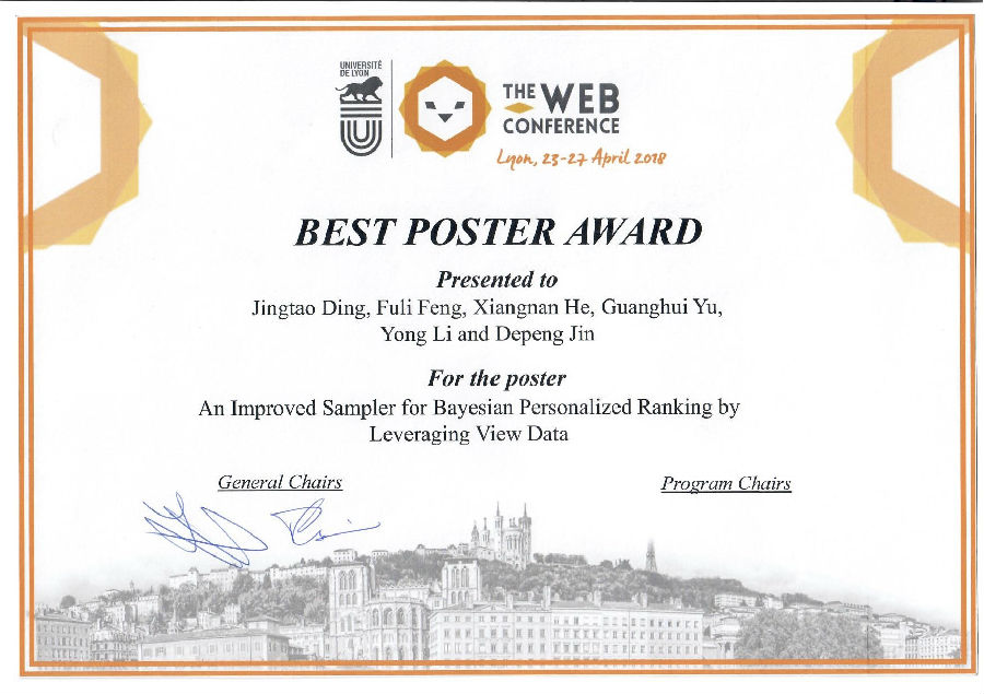 Recently, at the 27th Web Conference (The Web Conference 2018, formerly known as The International World Wide Web Conference - WWW), Chairman of the Conference Pierre-Antoine Champin announced that one of the three awards of the conference - - the unique Best Poster Award was presented to "An Improved Sampler for Bayesian Personalized Ranking by Leveraging View Data", a paper jointly completed by the team of Professor Jin Depeng and Associate Professor Li Yong of the Department of Electronic Engineering, Tsinghua University in cooperation with National University of Singapore. The first author of the paper is Ding Jingtao, a doctoral student of the Department of Electronic Engineering, Tsinghua University (supervisor: Professor Jin Depeng), andYuGuanghui, an undergraduate of the Department of Electronic Engineering also participated in it.