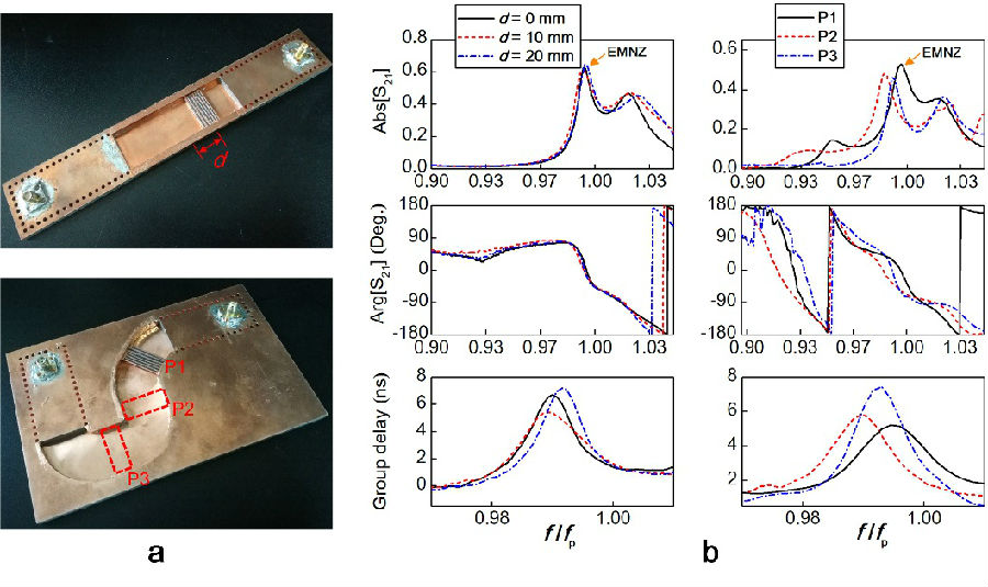 Experimental observation of the substrate-integrated photonic doping characteristics: (a) Test platform, (b) Near-zero reflection, zero phase, high-group delay phenomenon