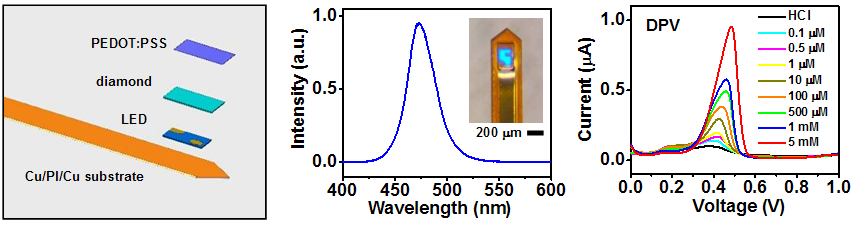 The work proposed a design idea of a wireless micro-thin-film-device-based implantable optoelectrochemical probe. A poly (3,4-ethylenedioxythiophene) polystyrene sulfonate (PEDOT:PSS)-coated diamond film is placed on the micro-LED, serving as an electrochemical sensor with high sensitivity, optical transparency, and good heat dissipation. At the same time, a micro-LED is used as an implantable light source; A set of efficient heterogeneous substrate integration process has been designed to realize the stacking and integration of micro-LED and electrochemical sensors on flexible substrates. Through the optimization of device packaging and the design of heat dissipation structure, obtaining the implantable optoelectrochemical probe. At the same time, a wirelessly operated, miniaturized circuit matching the optoelectrochemical probe has been developed to realize the remote optical control of the neural circuits and electrochemical data acquisition.