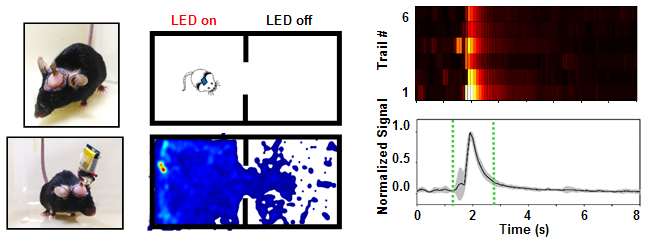 In experiments performed in vivo, the dopamine detection limit concentration of the multifunctional probe is about 0.1uM, and the design of the heat dissipation structure reduces the surface temperature of the micro-LED by 50%, which meets the requirements of in vivo experiments. In the ventral tegmental area (VTA) of the midbrain of experimental mice, the optogenetic stimulation and electrochemical detection functions of the multifunctional probe were verified. Through the wireless transmission system, the remote optogenetic control of mouse behavior can be realized, the animal's position preference can be changed, and the spontaneous dopamine neurotransmitter release signal can also be successfully captured. The in vivo experiment results showed that the optoelectrochemical probe has the remote, real-time optogenetic stimulation and electrochemical detection functions. The research provides technical support for the exploration of the relationship between neuronal activities and neurotransmitter release, and the in-depth research of the mechanism of neural circuits.