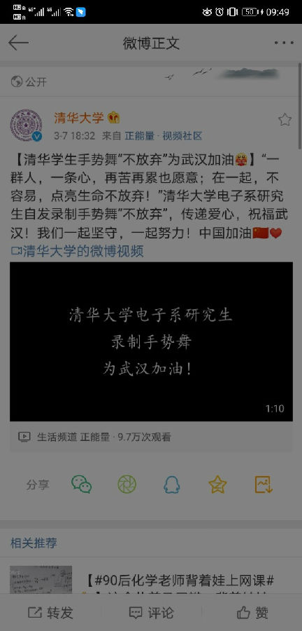 The students of the Department of Electronic Engineering got organized spontaneously to "record videos" at home and designed and performed the gesture dance "Never Give Up" to cheer Wuhan and China. The dance video was forwarded by official account of Tsinghua University with nearly 100,000 clicks.