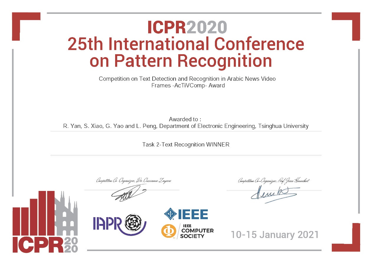 Recently, the 25th International Conference on Pattern and Recognition (ICPR) was held online. The results of the third Competition on Text Detection and Recognition in Arabic News Video Frames (AcTiVComp) were announced, and Ph. D. candidate YAN Ruijie and Master candidate XIAO Shanyu, etc. advised by Associate Professor PENG Liangrui from the Department of Electronic Engineering at Tsinghua University were champions in both tasks of text detection and text recognition.